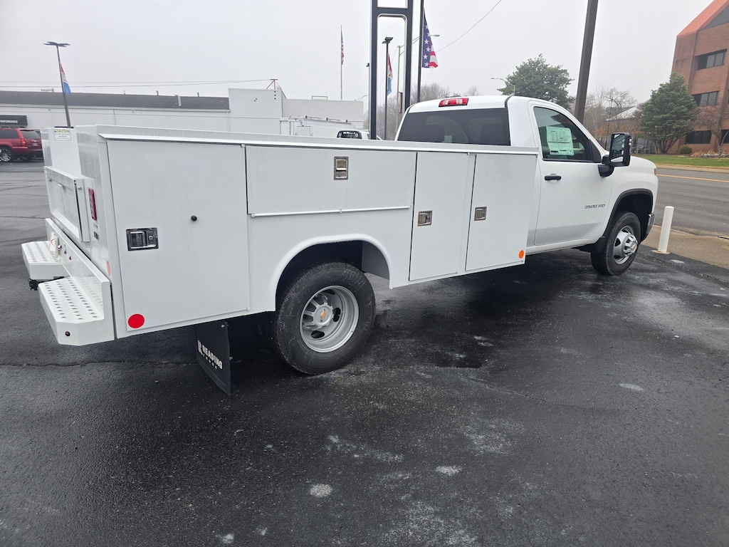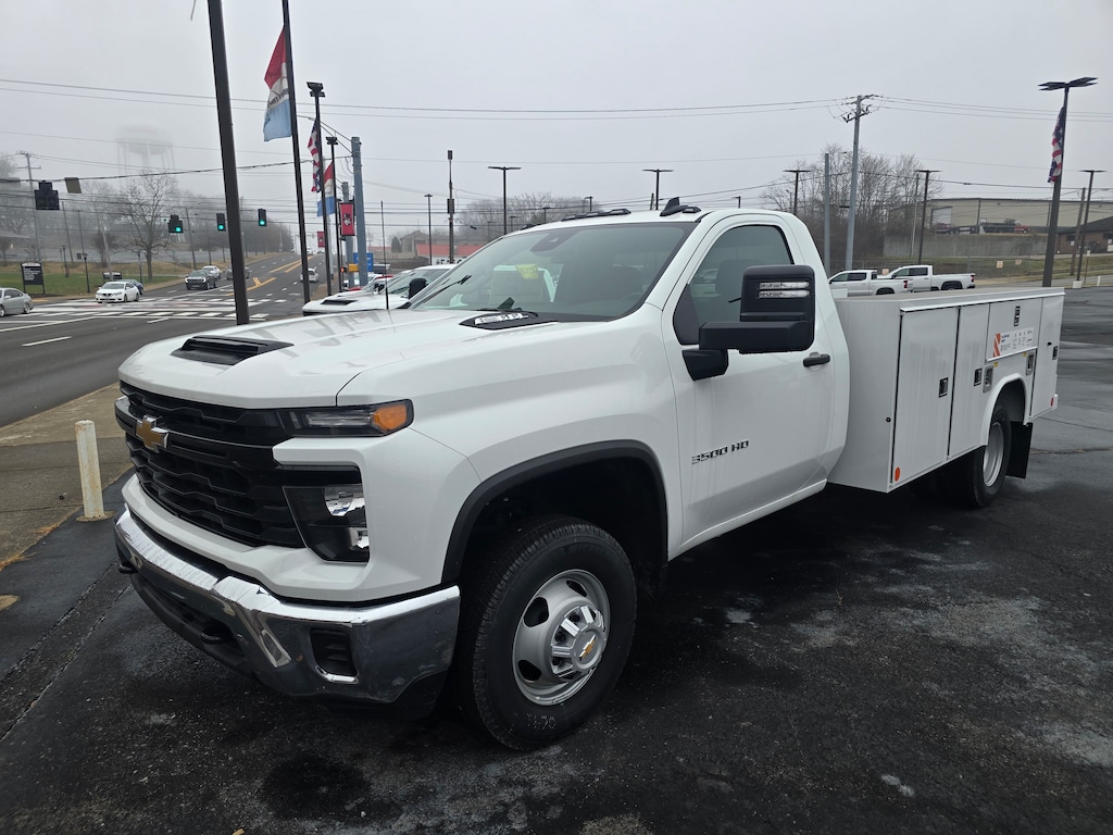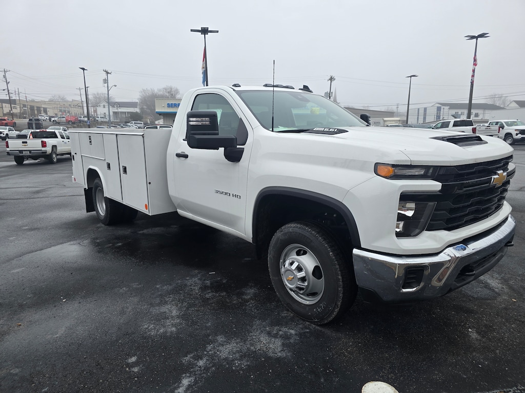 SERVICE BODY INCLUDED! Sale Price $57,042 for this Summit White 2025 Chevrolet Silverado 3500HD Work Trucko n sale at Serra Chevrolet Clarksville with Preferred Equipment Group 1WT (170 Amp Alternator, 3.5 Diagonal Monochromatic Display DIC, Black Front Bumper, Black Mirror Caps, Bluetooth® For Phone, Compass Located In Instrument Cluster, Manual Tilt-Wheel Steering Column, Rubberized-Vinyl Floor Covering, Solar Absorbing Tinted Glass, and Steering Wheel Mounted Electronic Cruise Control), Suspension Package, WT Convenience Package (Deep-Tinted Glass and Electric Rear-Window Defogger), 10-Speed Automatic, Jet Black Vinyl, 120-Volt (400 Watts) Interior Power Outlet, 17 Painted Steel Wheels, 18 Painted Steel Wheels, 2 Speakers, 2-Speaker Audio System Feature, 3.73 Rear Axle Ratio, 4-Way Manual Driver Seat Adjuster, 4-Way Manual Passenger Seat Adjuster, 4-Wheel Disc Brakes, ABS brakes, Air Conditioning, AM/FM radio, Auto High-beam Headlights, Auto-Dimming Inside Rear-View Mirror, Brake assist, Compass, Delay-off headlights, Driver door bin, Dual front impact airbags, Dual front side impact airbags, Dual rear wheels, Electronic Stability Control, Front 40/20/40 Split-Bench Seat, Front anti-roll bar, Front Center Armrest w/Storage, Front Chrome Bumper, Front Grille Bar w/Black Mesh Inserts, Front License Plate Kit, Front reading lights, Front wheel independent suspension, Fully automatic headlights, Heavy-Duty 80 Amp-Hr Battery, Illuminated entry, Low tire pressure warning, Manual Tilt Inside Rearview Mirror, Occupant sensing airbag, OnStar Services Capable, Outside temperature display, Overhead airbag, Overhead console, Panic alarm, Passenger door bin, Passenger vanity mirror, Perimeter Lighting, Power steering, Power windows, Power-Adjustable Outside Mirrors, Radio: Chevrolet Infotainment 3 System, Remote keyless entry, Speed control, Tachometer, Tilt steering wheel, Traction control, Trip computer, Upfitter Switch Kit (5), Variably intermittent wipers, Vinyl Seat Trim, and Voltmeter.