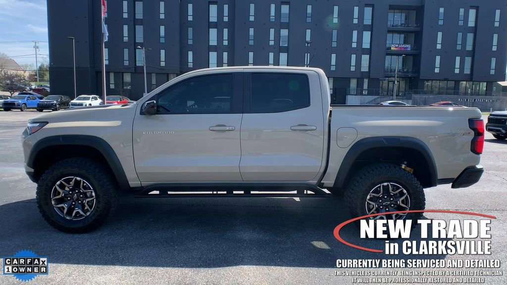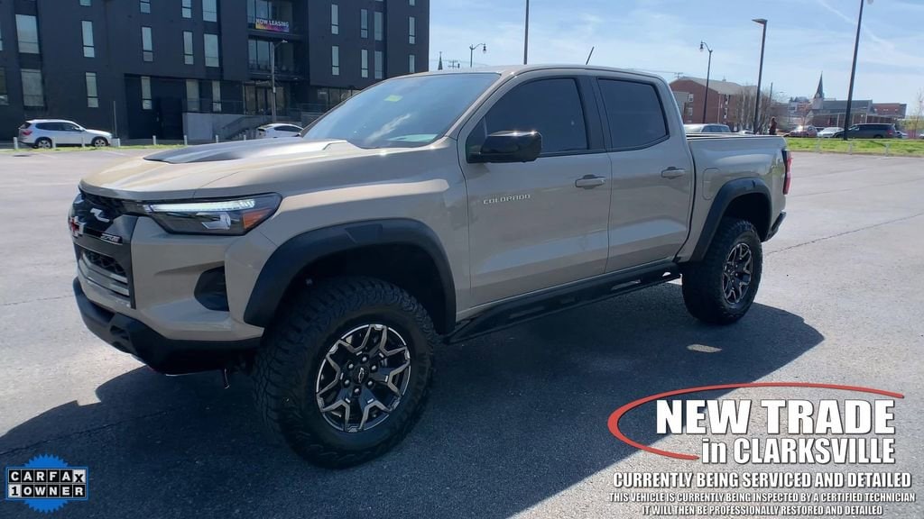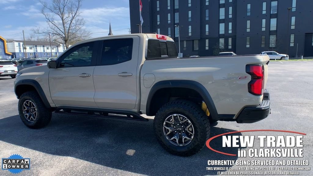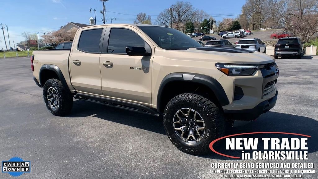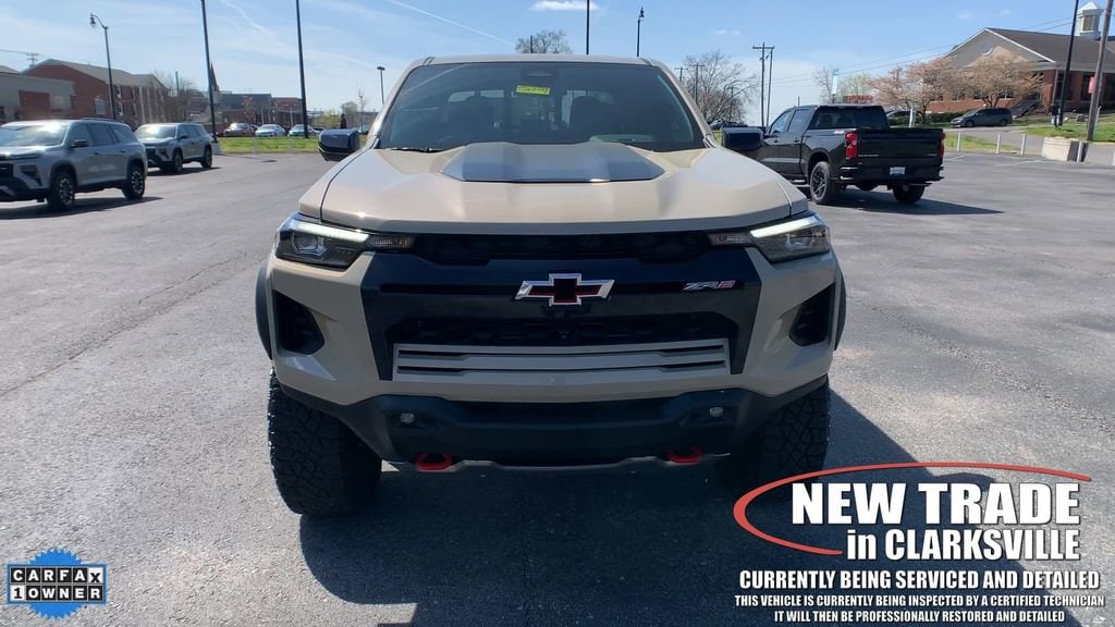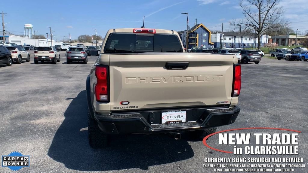 The Pre-Owned 2024 Chevrolet Colorado ZR2 with 2.7L I4 Turbocharged DOHC 16V LEV3-ULEV50 310hp at Serra Clarksville. Well equipped: Preferred Equipment Group 4ZR (Automatic Emergency Braking, Chevy Safety Assist, Electronic Automatic Cruise Control, Following Distance Indicator, Forward Collision Alert, Front Pedestrian & Bicyclist Braking, IntelliBeam Automatic High Beam On/Off, Lane Keep Assist w/Lane Departure Warning, and Rear-Window Electric Defogger), Safety Package (Blind Zone Steering Assist w/Trailering, Rear Cross Traffic Braking, and Rear Park Assist), Technology Package (Adaptive Cruise Control, HD Surround Vision, and Rear Pedestrian Alert), ZR2 Convenience Package III (Driver & Front Passenger Ventilated Seats, Driver Memory Settings, Driver Seatback Map Pocket, Heated Steering Wheel, Perforated Leather-Appointed Seat Trim, Rear Center Armrest, and Wireless Charging), ZR2 Off-Road Package, 4WD, 1st & 2nd Row All-Weather Floor Liner (LPO), 3.42 Rear Axle Ratio, 4-Way Manual Passenger Seat Adjuster, 4-Wheel Disc Brakes, 6 Speakers, 6-Speaker Audio System Feature, 8-Way Power Driver Seat Adjuster, ABS brakes, Air Conditioning, Alloy wheels, AM/FM radio: SiriusXM, Apple CarPlay/Android Auto, Auto High-beam Headlights, Auto-dimming Rear-View mirror, Automatic temperature control, Bose Premium 7-Speaker Audio System Feature, Brake assist, Cloth/Evotex Seat Trim, Compass, Delay-off headlights, Driver door bin, Driver vanity mirror, Dual front impact airbags, Dual front side impact airbags, Electronic Stability Control, Front anti-roll bar, Front Bucket Seats, Front Center Armrest, Front dual zone A/C, Front fog lights, Front Passenger Seatback Map Pocket, Front reading lights, Front wheel independent suspension, Heated door mirrors, Heated Driver & Front Passenger Seats, Heated front seats, Illuminated entry, Low tire pressure warning, Navigation System, Occupant sensing airbag, Outside temperature display, Overhead airbag, Overhead console, Panic alarm, Passenger door bin, Passenger vanity mirror, Power door mirrors, Power Driver Lumbar Control Seat Adjuster, Power driver seat, Power Sliding Glass w/Manual Shade Sunroof, Power steering, Power windows, Radio data system, Radio: 11.3 Diagonal Advanced Color LCD Display, Rear reading lights, Rear step bumper, Rear window defroster, Remote keyless entry, Security system, SiriusXM Radio, Speed control, Speed-sensing steering, Split folding rear seat, Steering Wheel Mounted Audio Controls, Steering wheel mounted audio controls, Tachometer, Telescoping steering wheel, Tilt steering wheel, Traction control, Trip computer, Variably intermittent wipers, Wheels: 17 x 8 Graphite & Oxide Gold Aluminum, and Wireless Phone Projection.