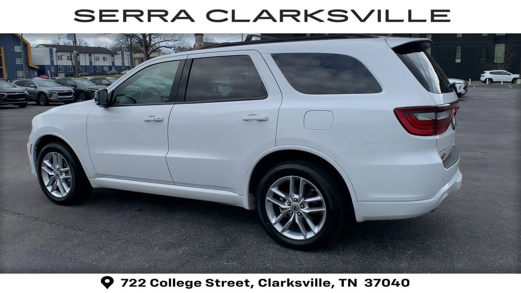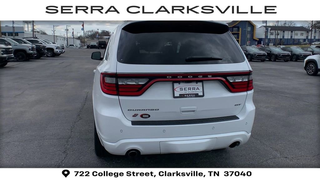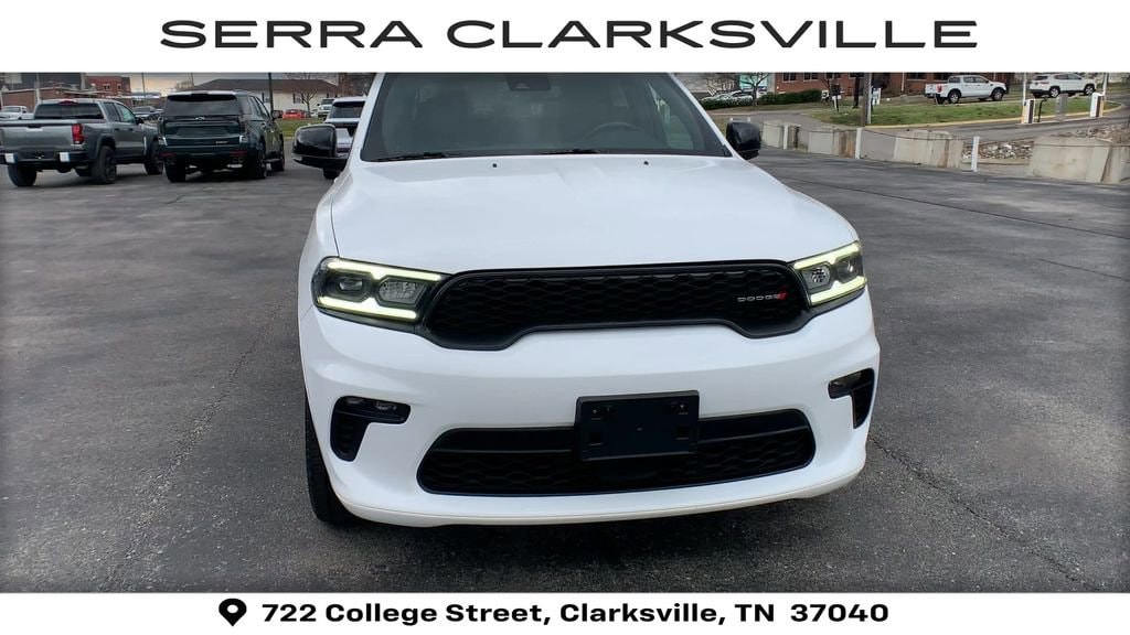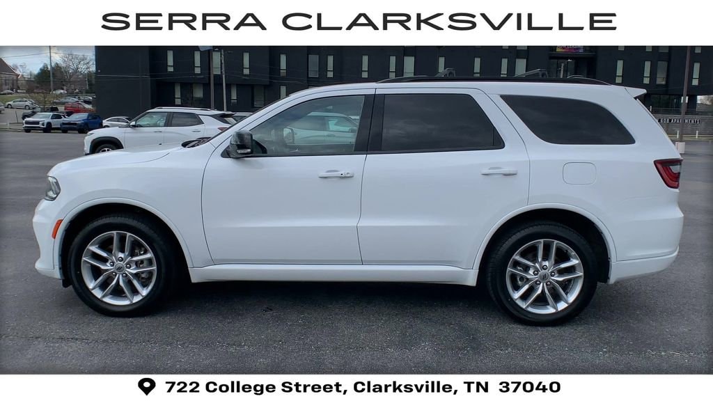 The Pre-Owned 2023 Dodge Durango GT Plus with 3.6L V6 24V VVT at Serra Clarksville. Well equipped: Quick Order Package 2BG GT Plus (1-Year Trial (Registration Required), 10.1 Touchscreen Display, 115V Auxiliary Power Outlet, 180 Amp Alternator, 4G LTE Wi-Fi Hot Spot, 7 & 4 Pin Wiring Harness, Adaptive Cruise Control w/Stop, Apple CarPlay, Auto-Dimming Exterior Driver Mirror, Black Roof Rails, Class IV Receiver Hitch, Connected Travel & Traffic Services, Disassociated Touchscreen Display, Dual Remote USB Port - Charge Only, Exterior Mirrors w/Heating Element, Exterior Mirrors w/Memory, Exterior Mirrors w/Supplemental Signals, Floor Console w/Leather Armrest, Full Speed Forward Collision Warning Plus, Gloss Black Exterior Mirrors, Google Android Auto, GPS Antenna Input, GPS Navigation, HD Radio, Heated Second Row Seats, Heavy-Duty Engine Cooling, Integrated Center Stack Radio, Integrated Roof Rail Crossbars, Integrated Voice Command w/Bluetooth, Leather Trimmed Bucket Seats, Leather Wrapped Door Panels, LED Auxiliary Low Beam & Turn Signal, Power 6x9 Multi-Function Foldaway Mirrors, Power 8-Way Driver Memory 8-Way Passenger Seats, Power Driver/Passenger 4-Way Lumbar Adjust, Power Sunroof, Power Tilt & Telescopic Steering Column, Premium LED Fog Lamps, Radio: Uconnect 5 Nav w/10.1 Display, Radio/Driver Seat/Mirrors Memory, Rear Load Leveling Suspension, Red Accent Stitching, SiriusXM Guardian - Included Trial (B), SiriusXM w/360L, Trailer Brake Control, USB Host Flip, and Ventilated Front Seats), AWD, 3.45 Rear Axle Ratio, 3rd row seats: split-bench, 4-Wheel Disc Brakes, 6 Speakers, ABS brakes, Air Conditioning, Alloy wheels, AM/FM radio: SiriusXM, Apple CarPlay/Android Auto, Auto-dimming Rear-View mirror, Automatic temperature control, Brake assist, Bumpers: body-color, Cloth Bucket Seats w/Shift Insert, Compass, Delay-off headlights, Driver door bin, Driver vanity mirror, Dual front impact airbags, Dual front side impact airbags, Electronic Stability Control, Four wheel independent suspension, Front anti-roll bar, Front Bucket Seats, Front Center Armrest w/Storage, Front dual zone A/C, Front License Plate Bracket, Front reading lights, Fully automatic headlights, Garage door transmitter, Heated door mirrors, Heated front seats, Heated steering wheel, Illuminated entry, Knee airbag, Leather steering wheel, Low tire pressure warning, Manufacturer's Statement of Origin, Occupant sensing airbag, Outside temperature display, Overhead airbag, Overhead console, Panic alarm, ParkView Rear Back-Up Camera, Passenger door bin, Passenger vanity mirror, Power door mirrors, Power driver seat, Power Liftgate, Power steering, Power windows, Radio data system, Radio: Uconnect 4 w/8.4 Display, Rear air conditioning, Rear anti-roll bar, Rear reading lights, Rear seat center armrest, Rear window defroster, Rear window wiper, Remote keyless entry, SiriusXM Radio Service, SiriusXM Satellite Radio, Speed control, Speed-sensing steering, Speed-Sensitive Wipers, Split folding rear seat, Spoiler, Sport steering wheel, Steering wheel mounted audio controls, Tachometer, Telescoping steering wheel, Tilt steering wheel, Traction control, Trip computer, Variably intermittent wipers, Voltmeter, and Wheels: 20 x 8.0 Fine Silver.