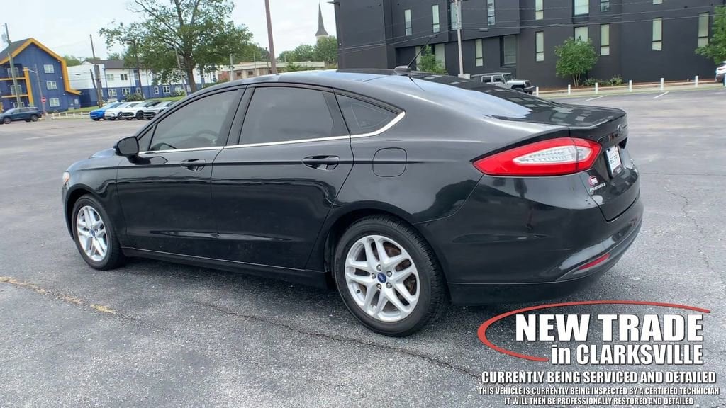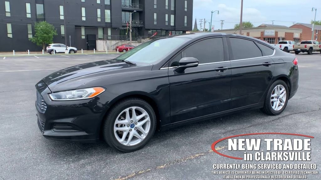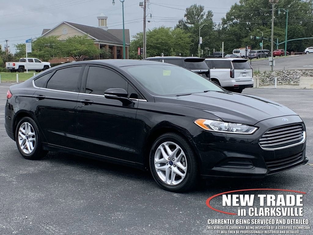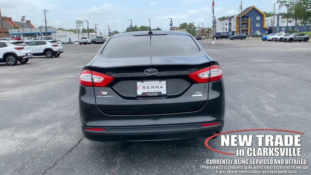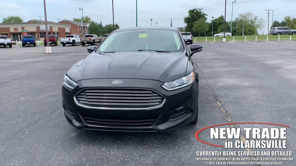 The Pre-Owned 2014 Ford Fusion SE with 1.5L EcoBoost at Serra Clarksville. Well equipped: Equipment Group 200A, 6-Speed Automatic, 17 Aluminum Wheels, 4-Wheel Disc Brakes, 6 Speakers, ABS brakes, Air Conditioning, Alloy wheels, AM/FM radio: SiriusXM, Brake assist, Bumpers: body-color, CD player, Cloth Front Bucket Seats, Compass, Delay-off headlights, Driver door bin, Driver vanity mirror, Dual front impact airbags, Dual front side impact airbags, Electronic Stability Control, Four wheel independent suspension, Front anti-roll bar, Front Bucket Seats, Front Center Armrest, Front License Plate Bracket, Front reading lights, Fully automatic headlights, Heated door mirrors, Illuminated entry, Knee airbag, Low tire pressure warning, Occupant sensing airbag, Outside temperature display, Overhead airbag, Overhead console, Panic alarm, Passenger door bin, Passenger vanity mirror, Power door mirrors, Power driver seat, Power steering, Power windows, Radio data system, Radio: AM/FM Stereo/MP3/Single-CD, Rear anti-roll bar, Rear reading lights, Rear seat center armrest, Rear window defroster, Remote keyless entry, Security system, Speed control, Speed-sensing steering, Speed-Sensitive Wipers, Split folding rear seat, Steering wheel mounted audio controls, SYNC Communications & Entertainment System, Tachometer, Telescoping steering wheel, Tilt steering wheel, Traction control, Trip computer, Turn signal indicator mirrors, and Variably intermittent wipers.