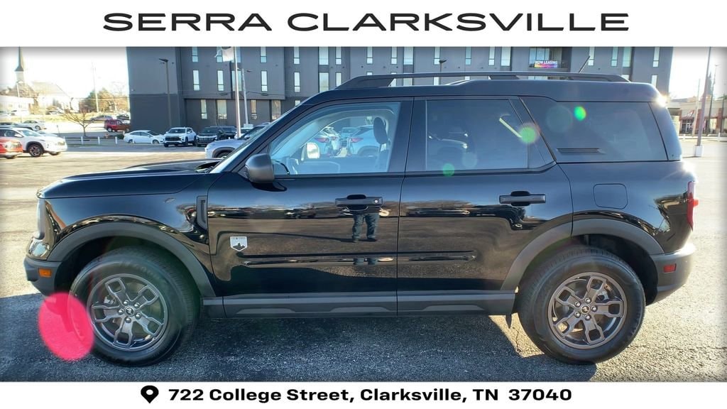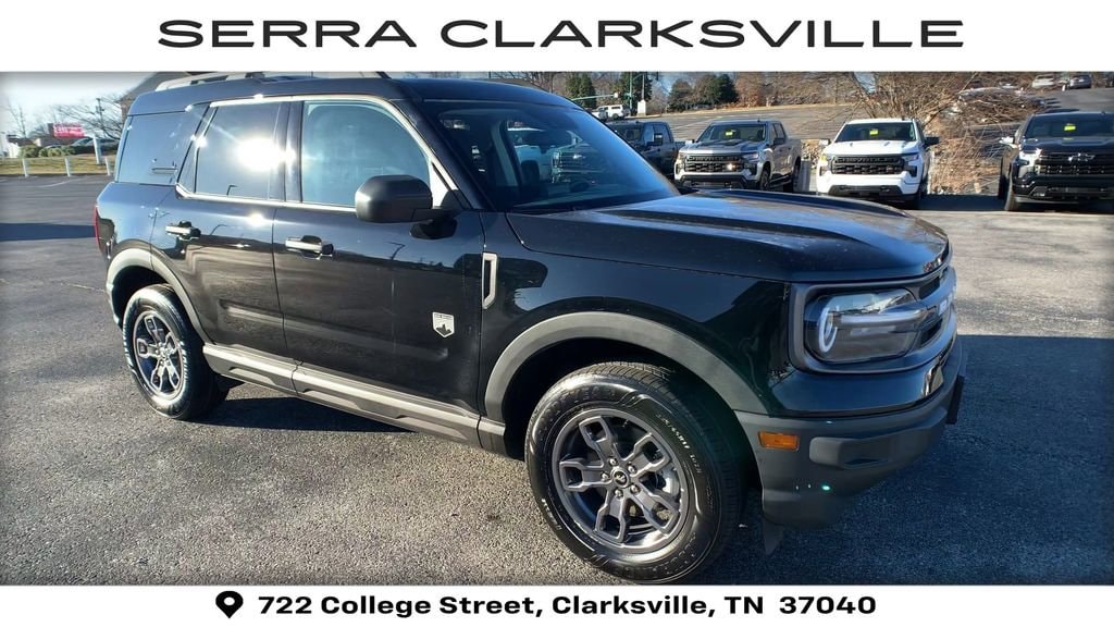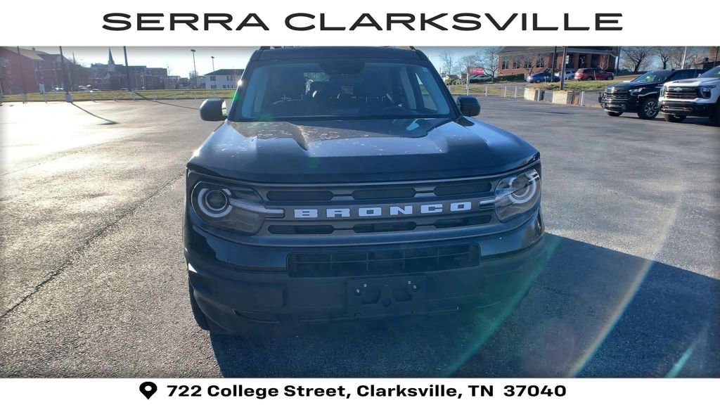 The Pre-Owned 2022 Ford Bronco Sport Big Bend with 1.5L EcoBoost at Serra Clarksville. Well equipped: Equipment Group 200A, 3.80 Axle Ratio, 4-Wheel Disc Brakes, 6 Speakers, ABS brakes, Air Conditioning, Alloy wheels, AM/FM radio: SiriusXM, AM/FM Stereo, Auto High-beam Headlights, Automatic temperature control, Brake assist, Compass, Delay-off headlights, Driver door bin, Driver vanity mirror, Dual front impact airbags, Dual front side impact airbags, Electronic Stability Control, Emergency communication system: SYNC 3 911 Assist, Four wheel independent suspension, Front anti-roll bar, Front Bucket Seats, Front Center Armrest, Front reading lights, Fully automatic headlights, Heated door mirrors, Illuminated entry, Knee airbag, Low tire pressure warning, Occupant sensing airbag, Outside temperature display, Overhead airbag, Overhead console, Panic alarm, Passenger door bin, Passenger vanity mirror, Power door mirrors, Power steering, Power windows, Radio data system, Rear anti-roll bar, Rear reading lights, Rear seat center armrest, Rear window defroster, Rear window wiper, Remote keyless entry, Roof rack: rails only, Security system, SiriusXM Radio, Speed control, Speed-sensing steering, Speed-Sensitive Wipers, Split folding rear seat, Steering wheel mounted audio controls, SYNC 3 Communications & Entertainment System, SYNC 3/Apple CarPlay/Android Auto, Tachometer, Telescoping steering wheel, Tilt steering wheel, Traction control, Trip computer, Unique Cloth Front Bucket Seats, Variably intermittent wipers, and Wheels: 17 Carbonized Gray-Painted Aluminum.