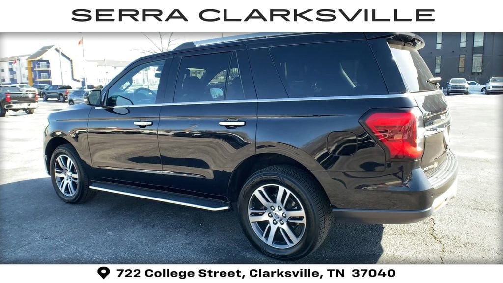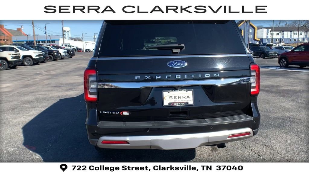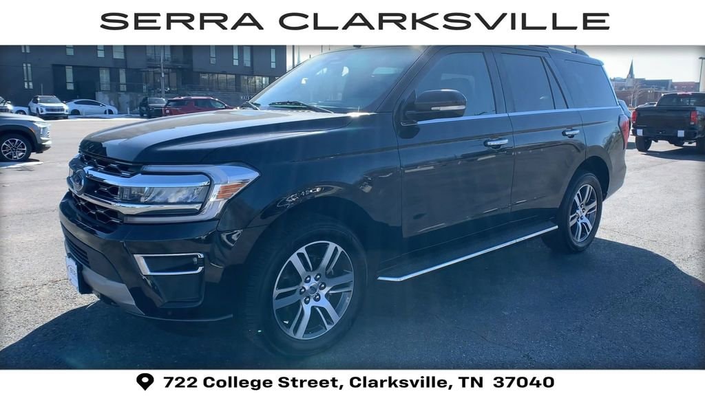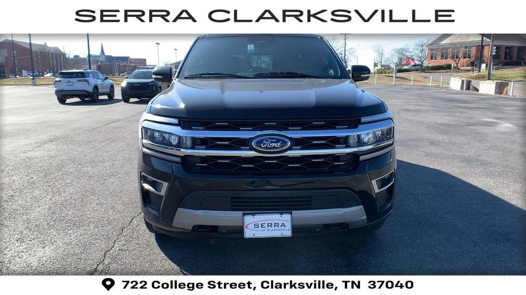 The Pre-Owned 2023 Ford Expedition Limited with EcoBoost 3.5L V6 GTDi DOHC 24V Twin Turbocharged at Serra Clarksville. Well equipped: Equipment Group 301A Mid Package (Panoramic Vista Roof), 4WD, 12 Speakers, 3.31 Axle Ratio, 3rd row seats: split-bench, 4-Wheel Disc Brakes, ABS brakes, Adjustable pedals, Air Conditioning, Alloy wheels, AM/FM radio: SiriusXM with 360L, Auto High-beam Headlights, Auto-dimming door mirrors, Auto-dimming Rear-View mirror, Automatic temperature control, Brake assist, Bumpers: body-color, Compass, Delay-off headlights, Driver door bin, Driver vanity mirror, Dual front impact airbags, Dual front side impact airbags, Electronic Stability Control, Emergency communication system: SYNC 4 911 Assist, Exterior Parking Camera Rear, Four wheel independent suspension, Front anti-roll bar, Front Bucket Seats, Front Center Armrest, Front dual zone A/C, Front fog lights, Front License Plate Bracket, Front reading lights, Fully automatic headlights, Garage door transmitter, Heated & Ventilated Leather Front Captain's Chairs, Heated door mirrors, Heated front seats, Heated rear seats, Heated steering wheel, Illuminated entry, Leather steering wheel, Low tire pressure warning, Memory seat, Navigation system: Connected Navigation, Occupant sensing airbag, Outside temperature display, Overhead airbag, Overhead console, Panic alarm, Passenger door bin, Passenger vanity mirror, Pedal memory, Power door mirrors, Power driver seat, Power Liftgate, Power moonroof, Power passenger seat, Power steering, Power windows, Radio data system, Radio: B&O Sound System by Bang & Olufsen, Rain sensing wipers, Rear air conditioning, Rear anti-roll bar, Rear reading lights, Rear window defroster, Rear window wiper, Reclining 3rd row seat, Remote keyless entry, Second Row Power Windows Removal, Security system, SiriusXM w/360L, Speed control, Speed-sensing steering, Speed-Sensitive Wipers, Split folding rear seat, Spoiler, Steering wheel memory, Steering wheel mounted audio controls, SYNC 4 w/Enhanced Voice Recognition, Tachometer, Telescoping steering wheel, Tilt steering wheel, Traction control, Trip computer, Turn signal indicator mirrors, Variably intermittent wipers, Ventilated front seats, Voltmeter, and Wheels: 20 Bright Machined Aluminum.