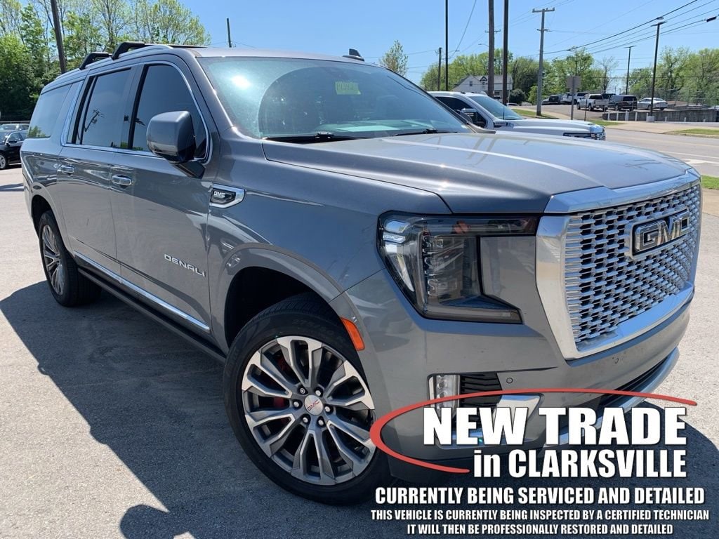 The Pre-Owned 2022 GMC Yukon XL Denali with EcoTec3 6.2L V8 at Serra Clarksville. Well equipped: Advanced Security Package (Glass Breakage Sensor, Theft-Deterrent Alarm System, Vehicle Inclination Sensor, and Vehicle Interior Movement Sensor), Advanced Technology Package (Adaptive Cruise Control, Enhanced Automatic Emergency Braking, Inside Rearview Auto-Dimming Rear Camera Mirror, Rear Camera Mirror Washer, and Reverse Automatic Braking), Cargo Convenience Package (Cargo Security Shade (LPO), Collapsible Cargo Area Organizer (LPO), and Vertical Cargo Net (LPO)), Denali Ultimate Package (DISC) (Dual-Pane Panoramic Power Sunroof, Power-Retractable Assist Steps, and Rear Seat Media System (DISC)), Max Trailering Package, Preferred Equipment Group 5SA (15 Diagonal Multi-Color Head-Up Display, 2 Presets For Outside Rearview Mirrors, 3 Years of GMC Connected Services, 3rd Row 60/40 Power-Folding Split-Bench Seat, Automatic Stop/Start, Bright Front & Rear Door Sill Plates, Chrome Door Handles w/Body-Color Strip, Dual Exhaust System, Floor Console, Galvano Bodyside Moldings, Hands-Free Power Programmable Rear Liftgate, HD Surround Vision, Heated & Ventilated Driver & Front Passenger Seats, Heated 2nd Row Outboard Position Seats, Heated Driver & Front Passenger Seats, Heated Steering Wheel, Hill Descent Control, Inside Rear-View Auto-Dimming Mirror, Outside Heated Power-Adjustable Mirrors, Power Release 2nd Row Bucket Seats, Power Tilt & Telescopic Steering Column, Rear Pedestrian Alert, Safety Alert Seat, Start/Stop System Disable Button, Universal Home Remote, and Wireless Charging), Premium Capability Package w/Active Response 4WD (Air Ride Adaptive Suspension and Electronic Limited Slip Differential (eLSD)), 4WD, 14 Speakers, 3.23 Rear Axle Ratio, 3rd row seats: split-bench, 4-Wheel Disc Brakes, ABS brakes, Adaptive suspension, Air Conditioning, Alloy wheels, AM/FM radio: SiriusXM with 360L, AM/FM Stereo, Apple CarPlay/Android Auto, Auto High-beam Headlights, Auto-dimming door mirrors, Auto-dimming Rear-View mirror, Auto-leveling suspension, Automatic Emergency Braking, Automatic temperature control, Black Roof Rack Cross Rails, Bodyside moldings, Bose 14-Speaker Surround w/CenterPoint, Brake assist, Bumpers: body-color, Compass, Delay-off headlights, Driver door bin, Driver vanity mirror, Dual front impact airbags, Dual front side impact airbags, Electronic Stability Control, Emergency communication system: OnStar and GMC Connected Services capable, Extra Capacity Cooling System, Following Distance Indicator, Forward Collision Alert, Four wheel independent suspension, Front & Rear Park Assist, Front anti-roll bar, Front Bucket Seats, Front Center Armrest, Front dual zone A/C, Front fog lights, Front Pedestrian Braking, Front reading lights, Fully automatic headlights, Garage door transmitter, Heads-Up Display, Heated door mirrors, Heated front seats, Heated rear seats, Heated steering wheel, Hitch Guidance w/Hitch View, Illuminated entry, Integrated Trailer Brake Controller, IntelliBeam Automatic High Beam On/Off, Jet Black Interior Trim, Lane Change Alert w/Side Blind Zone Alert, Lane Keep Assist w/Lane Departure Warning, Leather steering wheel, Low tire pressure warning, Magnetic Ride Control Suspension, Memory seat, Navigation System, Not Equipped w/4-Way Driver & Fr Pass Pwr Lumbar, Not Equipped w/Steering Column Lock, Occupant sensing airbag, Outside temperature display, Overhead airbag, Overhead console, Panic alarm, Passenger door bin, Passenger vanity mirror, Perforated Leather Seating Surfaces, Power door mirrors, Power driver seat, Power Liftgate, Power passenger seat, Power steering, Power windows, Rain sensing wipers, Rear air conditioning, Rear anti-roll bar, Rear Cross Traffic Alert, Rear reading lights, Rear window defroster, Rear window wiper, Remote keyless entry, Roof rack: rails only, Security syst